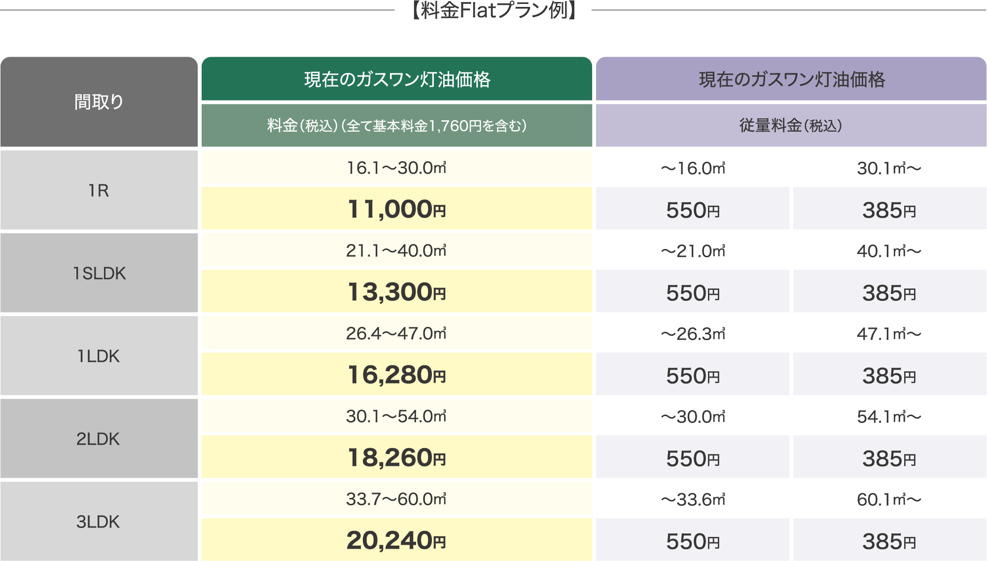 | 間取り | 現在のガスワン灯油価格 | 現在のガスワン灯油価格 | |